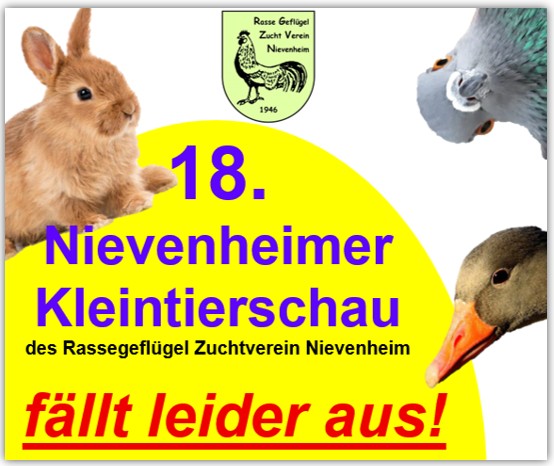 Organisatorische Probleme in unserem Verein zwingen uns leider in diesem Jahr zu diesem Schritt. Aber es ist ein einmaliger Schritt, zum 80jährigen Geburtstag im nächsten Jahr wird die 18. Nievenheimer Kleintierschau nachgeholt und wir werden dann hoffentlich gemeinsam am letzten Oktoberwochenende feiern.